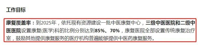《通知》指出到2025年,依托現有資源布局建設一批中醫康復中心,三級中醫醫院和二級中醫醫院設置康復(醫學)科的比例分別達到85%、70%,康復醫院全部設置傳統康復治療室,鼓勵其他提供康復服務的醫療機構普遍能夠提供中醫藥康復服務。