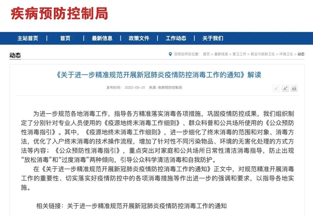 2022 年 5 月 31 日,國家衛健委發布《關于進一步精準規范開展新冠肺炎疫情防控消毒工作的通知》,制定了分別針對專業人員使用的《疫源地終末消毒工作細則》、群眾科普和公共場所使用的《公眾預防性消毒指引》。其中,《疫源地終末消毒工作細則》,優化了入戶終末消毒的技術操…