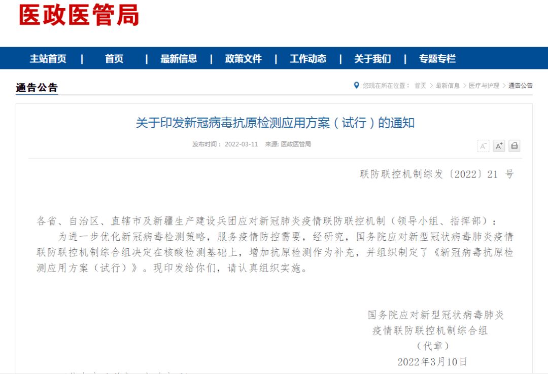 3月11日,國家衛生健康委員會官網發布《關于印發新冠病毒抗原檢測應用方案(試行)的通知》(簡稱“通知”),表示決定在核酸檢測基礎上,增加抗原檢測作為補充,并組織制定了《新冠病毒抗原檢測應用方案(試行)》(簡稱“試行方案”)。