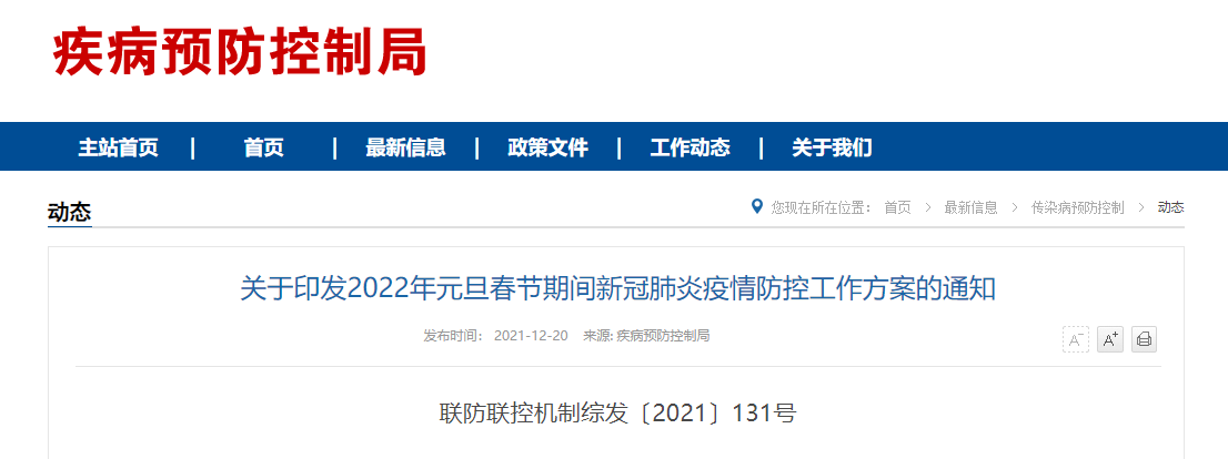 12月20日,國家衛(wèi)健委疾控局印發(fā)《關(guān)于2022年元旦春節(jié)期間新冠肺炎疫情防控工作方案的通知》