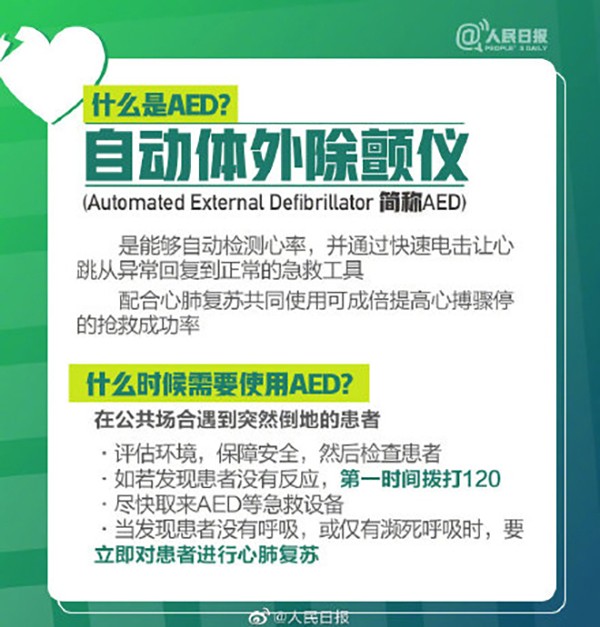 收藏!救命神器AED簡明使用攻略AED就是自動體外除顫儀,有“救命神器”之譽。配合心肺復蘇,黃金4分鐘使用AED能大幅提高救活率。不要擔心不會使用,AED內置語音提示,聽它說,跟它做。掌握關鍵急救知識↓↓希望你用不到,但一定要知道。