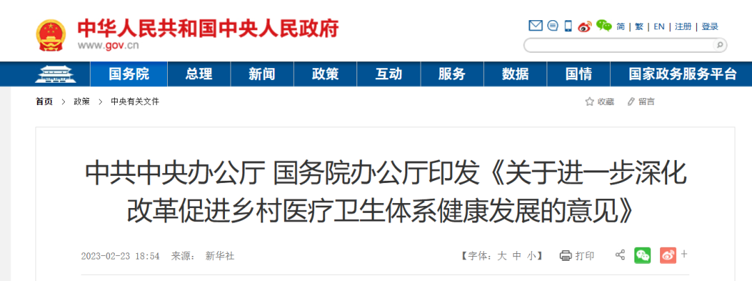 2月23日,國務院印發《關于進一步深化改革促進鄉村醫療衛生體系健康發展的意見》。