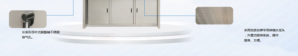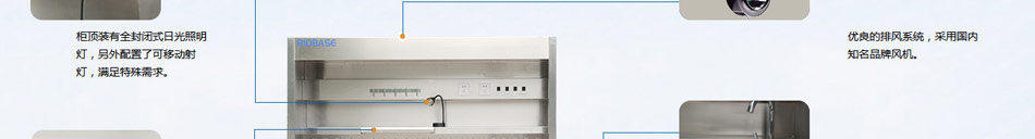2. 下排氣系統,大功率吸風裝置,低噪音。下排風,長條形百葉式耐酸堿不銹鋼排氣孔。泛仕達250風機。(標配)