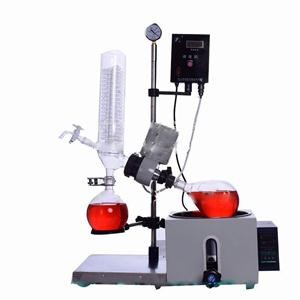 旋轉蒸發器是在真空負壓條件下,利用恒溫加熱,薄膜蒸發的原理研制而成。旋轉蒸發器用無級調速使玻璃旋轉瓶恒速旋轉,物料在瓶壁形成大面積均勻薄膜,再由智能恒溫水浴鍋對旋轉瓶均勻加熱,在真空條件下高速蒸發,溶媒蒸氣經高效玻璃冷凝器冷卻,回收于收集瓶。