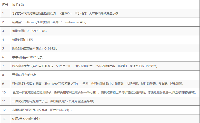 Ultrasnap&Aquasnap——ATP(三磷酸腺苷)存在于所有的生命有機體中,因此檢測表面和水里的ATP含量可以很好的反應總體衛(wèi)生狀況。消毒和清潔后,所有來源的ATP會顯著減少。當ATP與Hygiena公司新型的Ultrasnap或Aquasnap檢測拭子里的液態(tài)穩(wěn)定試劑接觸時,就產(chǎn)生光強度與ATP數(shù)量成正比的光。EnSURE通過檢測產(chǎn)生的光度值來及時反映污染水平。