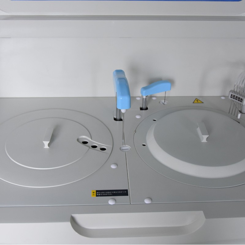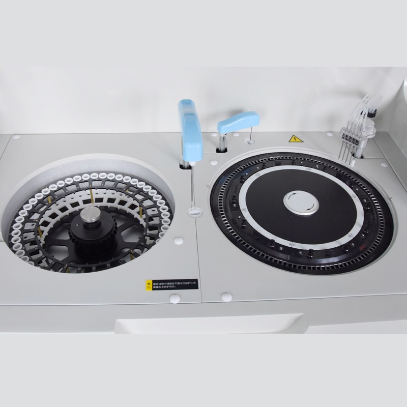 11、試劑盤:56個試劑位,最大可同時分析56個生化試劑項目;同一項目可安排多個試劑位,第一個報警缺少試劑時自動到第二試劑位抽取試劑,依次類推。